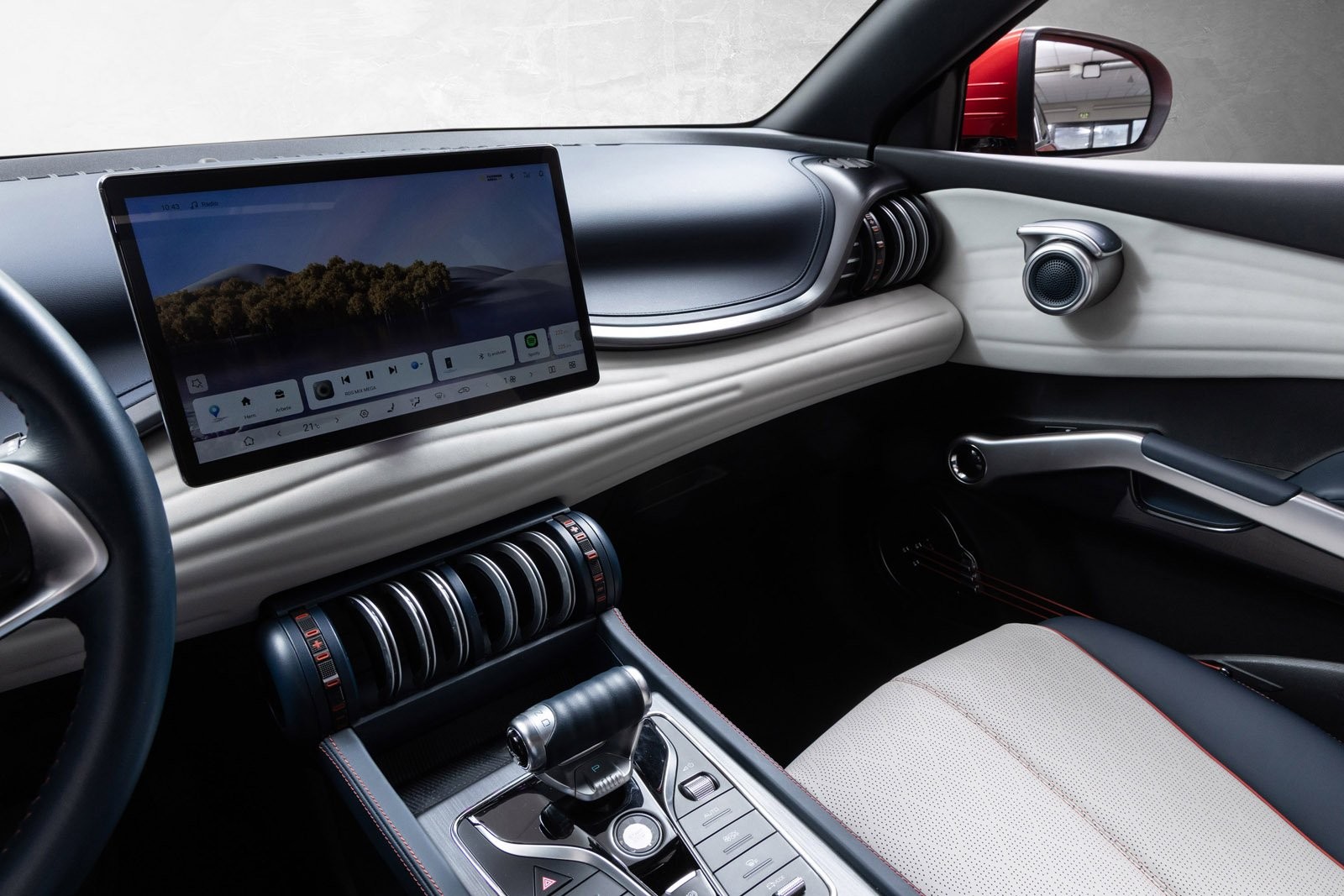 Bilen er godt utstyrt med panorama glasstak som skaper en luftig og lys kjøreopplevelse. Sikkerhetsutstyret er omfattende med 360 graders overvåkning, blindsoneovervåker, kollisjonsvarsler og automatisk nødbremsing. Komfortutstyret inkluderer automatisk klimaanlegg, oppvarmede forseter, elektriske og oppvarmede speil, samt multifunksjonsratt.